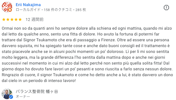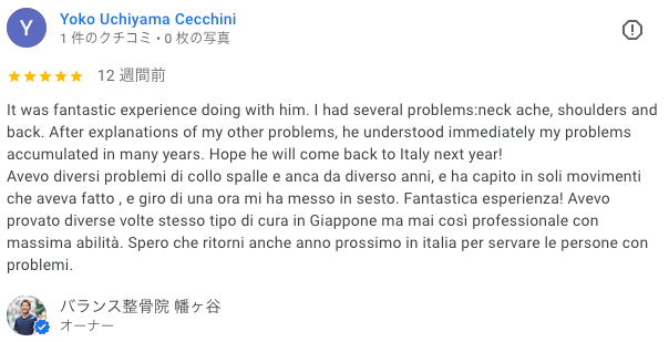 先生、日本語で腰痛の治療が受けれる場所がイタリアには無くて困ってます。😭